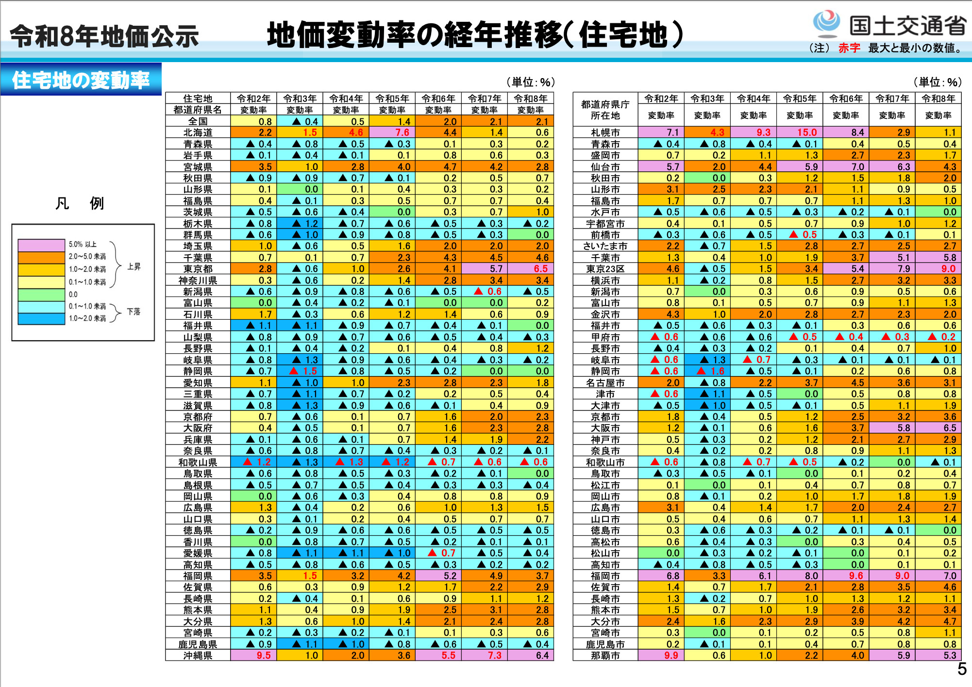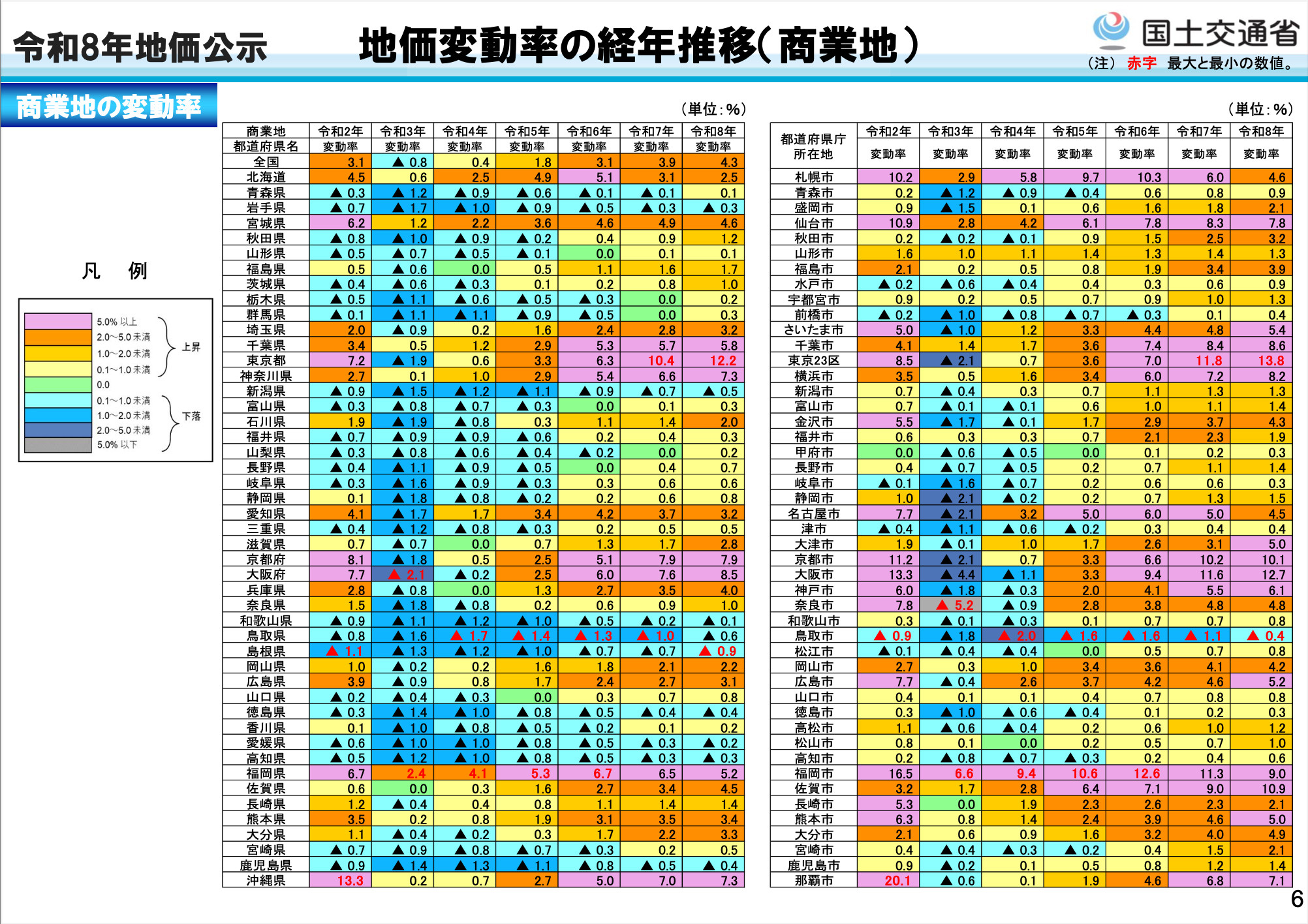 住宅地は2.1%上昇(同:2.1%上昇)、商業地は4.3%上昇(同:3.9%上昇)となりました。